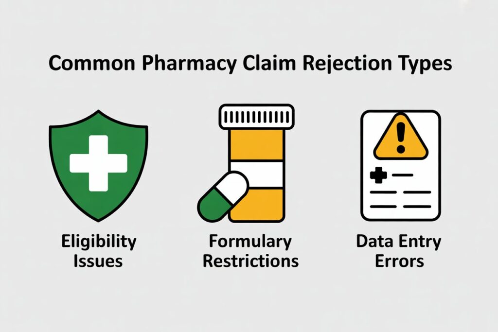 Rejection codes fall into three main groups: eligibility/coverage, drug/formulary issues, and data-entry/system errors.